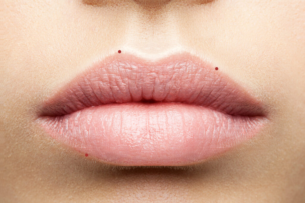 - Markiere asymmetrische Bereiche der Lippenform mit Punkten oder Strichen außerhalb der Lippen, um das spätere Vorzeichnen zu erleichtern und auszugleichen.